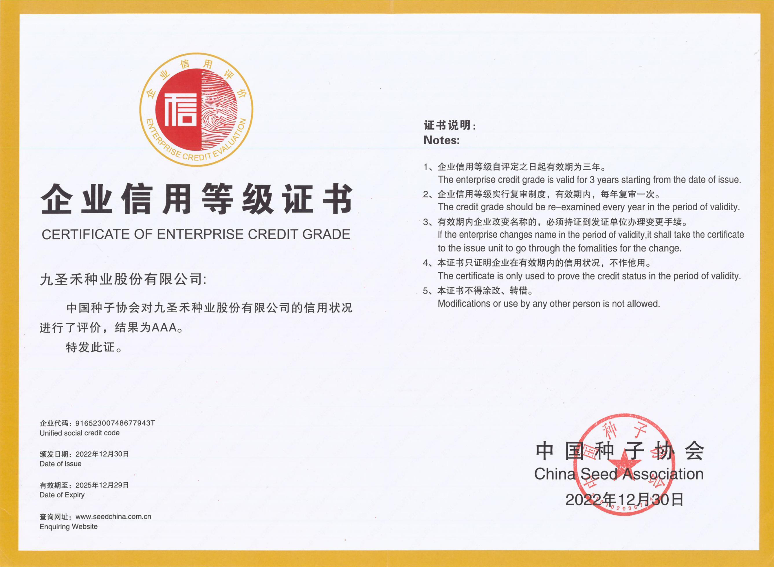 企业信用等级证书AAA(2022.12.30-2025.12.29)