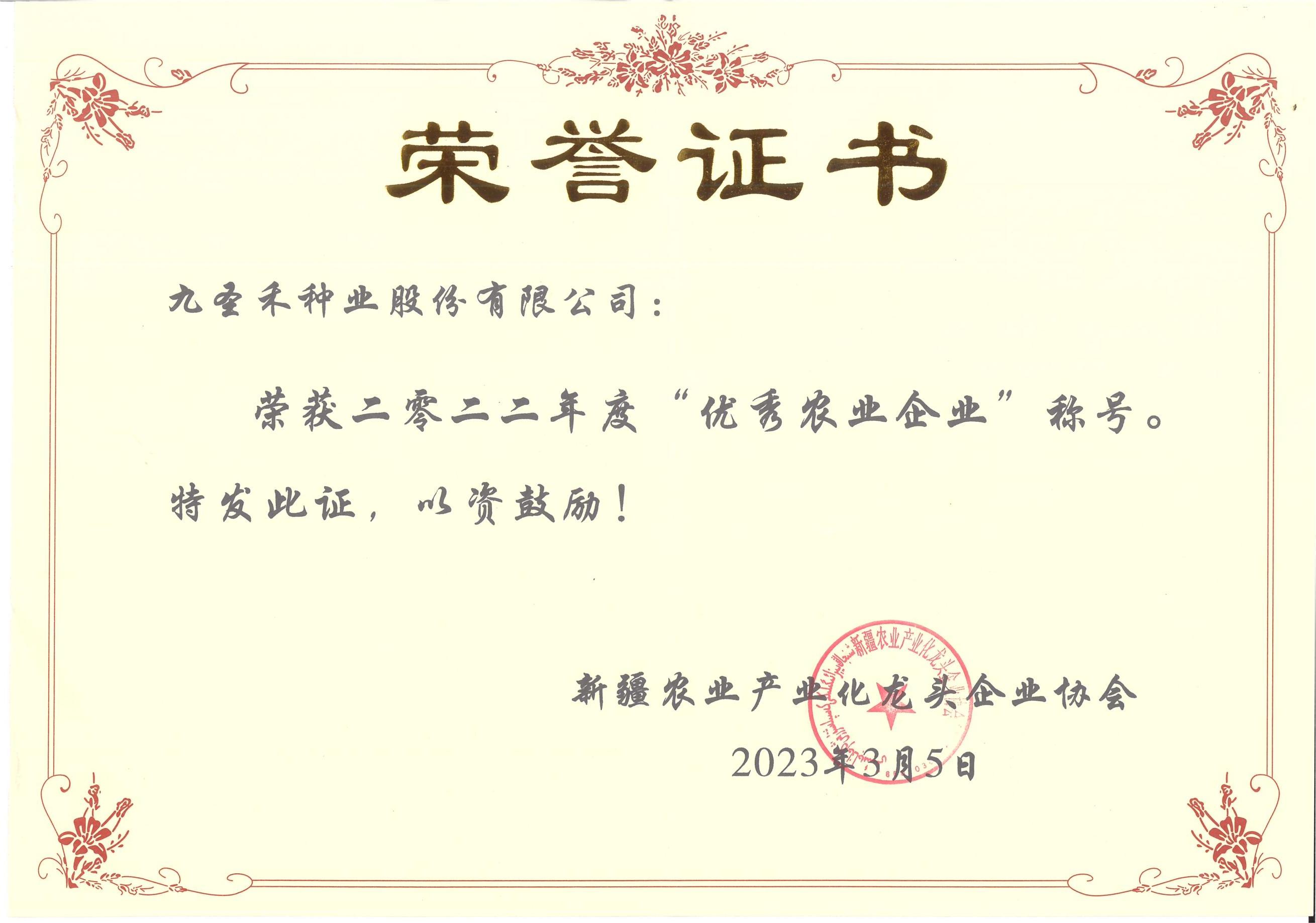 新疆农业产业化龙头企业协会 优秀农业企业(2023.3)