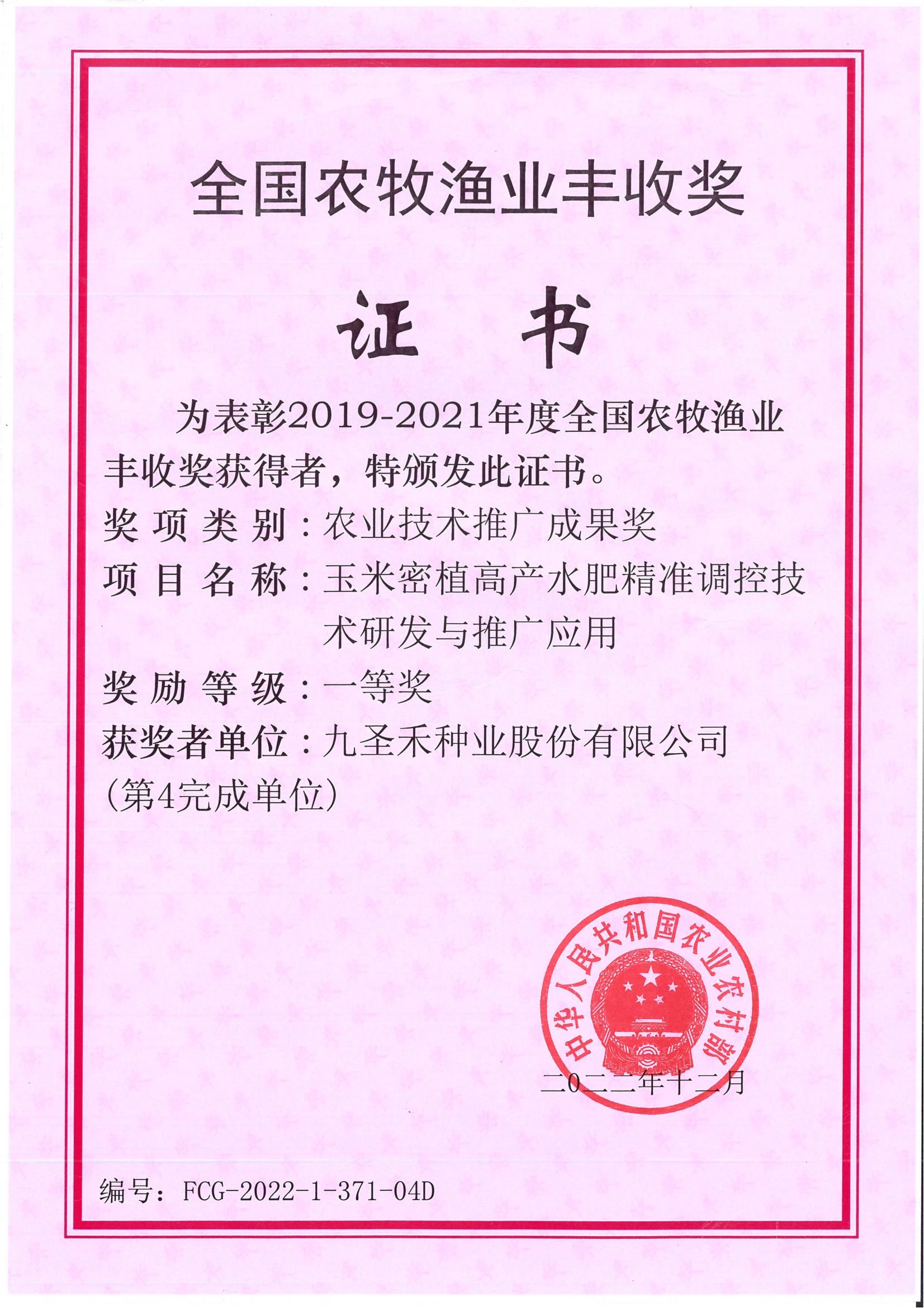 2019-2021年度全国农牧渔业丰收奖(玉米密植高产水肥精准调控技术研发与推广应用)一等奖