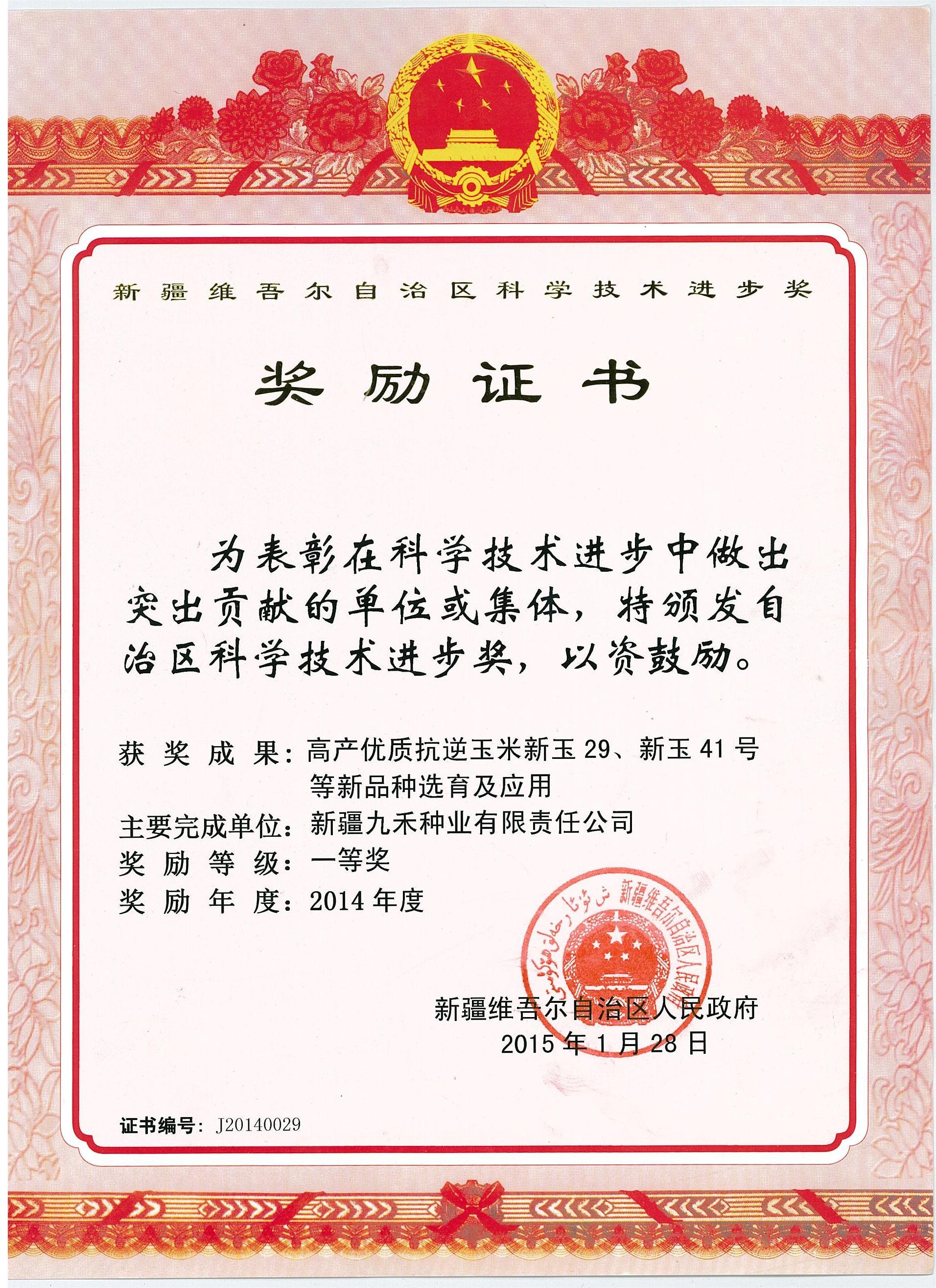 2014年自治区科学技术进步奖(一等奖)